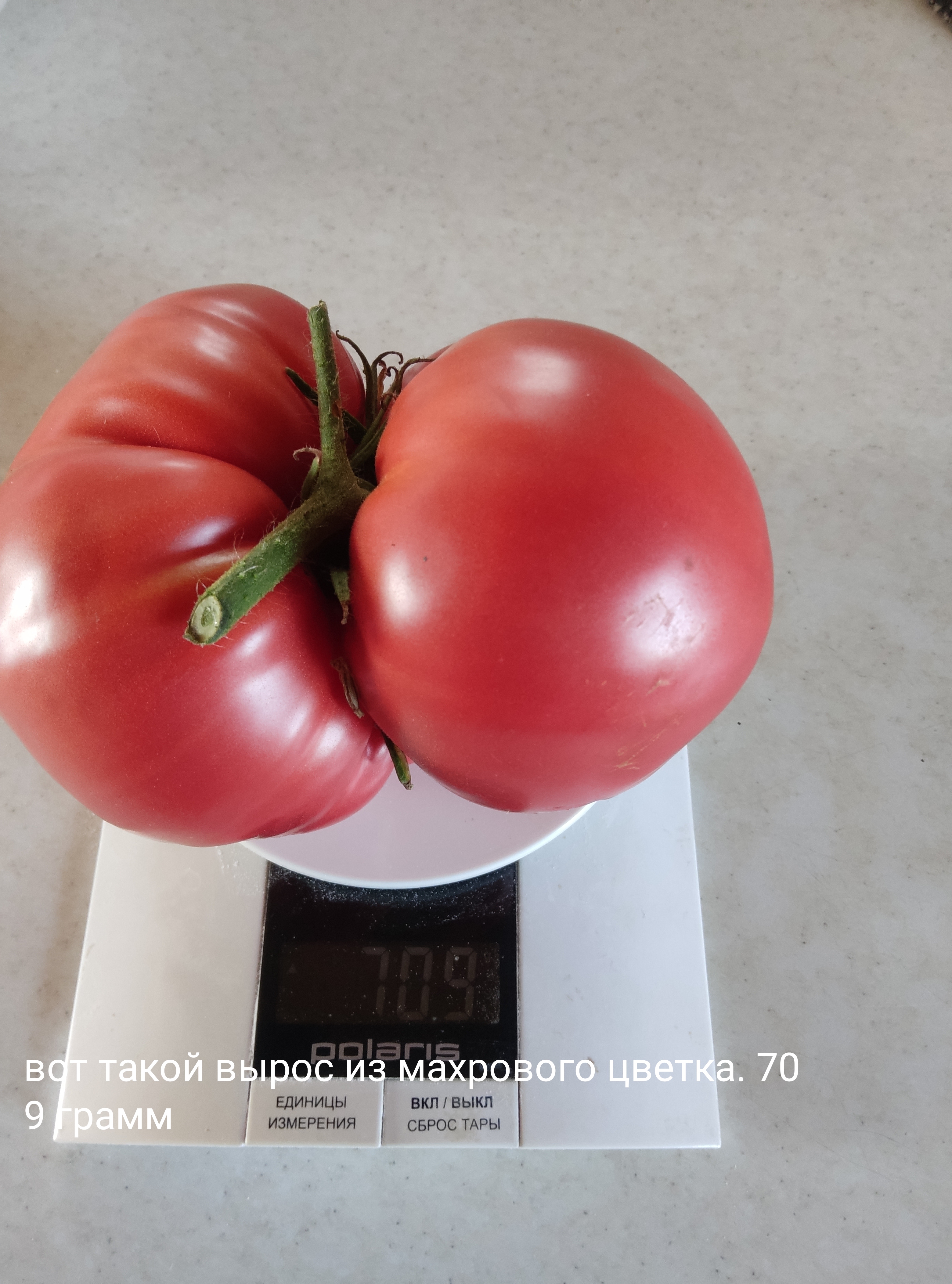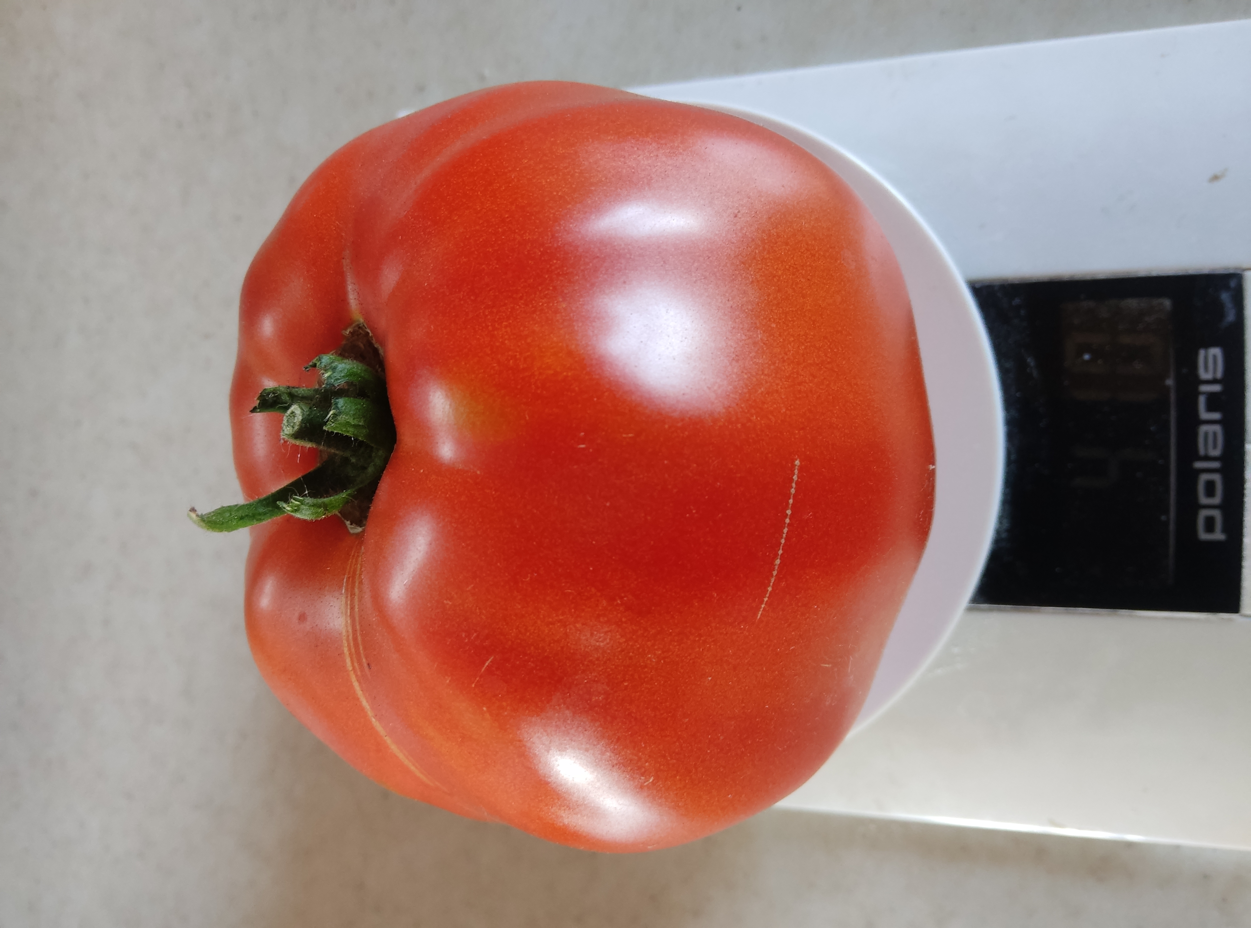 А еще не знаю названия сорта, но очень хорошие помидорки растут. Взяла помидорину на семена у соседки, конечно, названия сорта она не знает, для неё один сорт существует - помидор. Рассаду ей дает сватья. Настя сейчас взвесила тоже 450 г. Я назвала этот сорт Марина. По имени хозяйки...