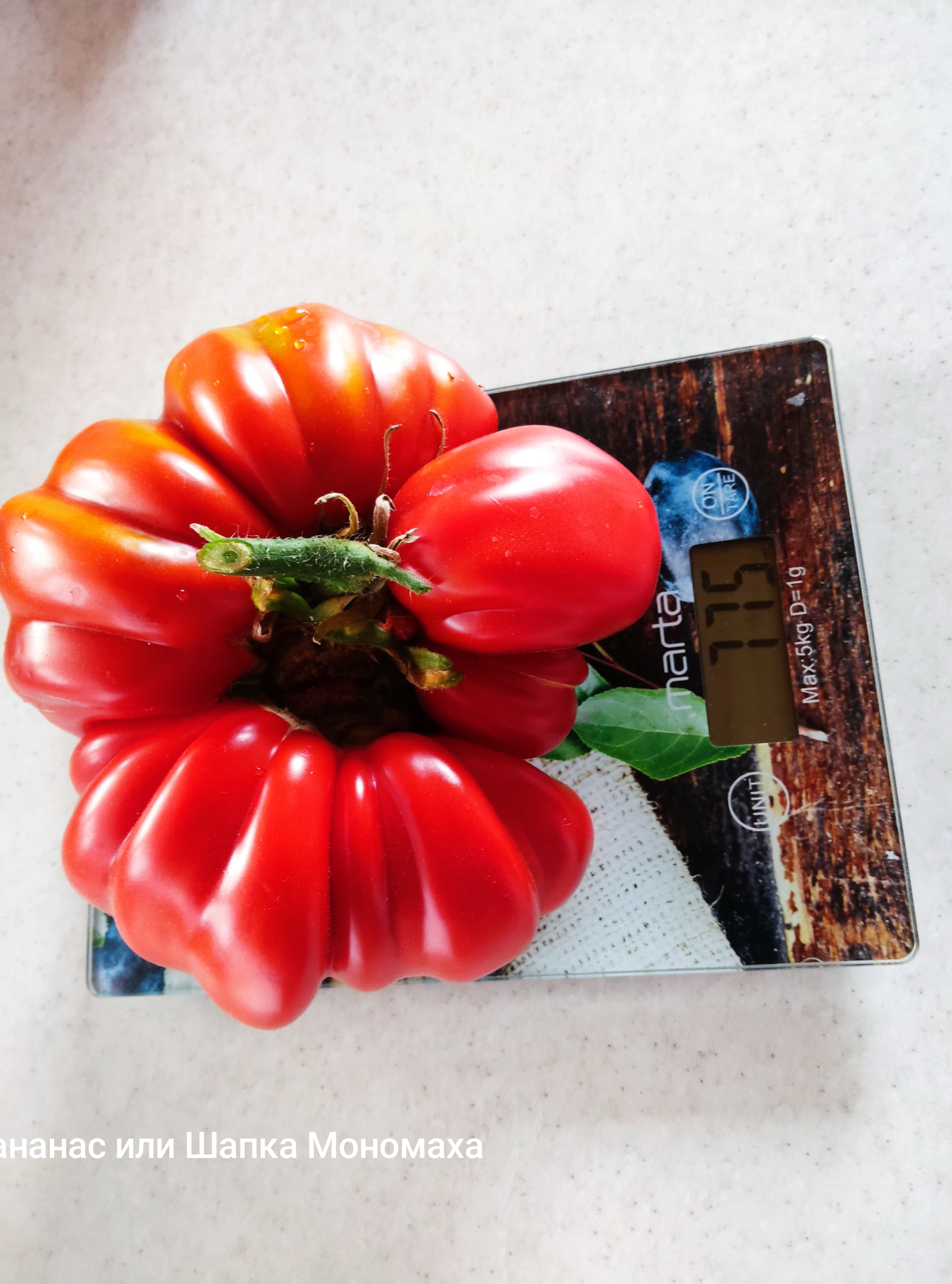 А в теплице куст или Ананас или Шапка Мономаха или Говядина-- что-то одно-- дал 8781 грамм. Было 25 плодов, из них половина по 700--800 грамм. Всё созрели на кусту.