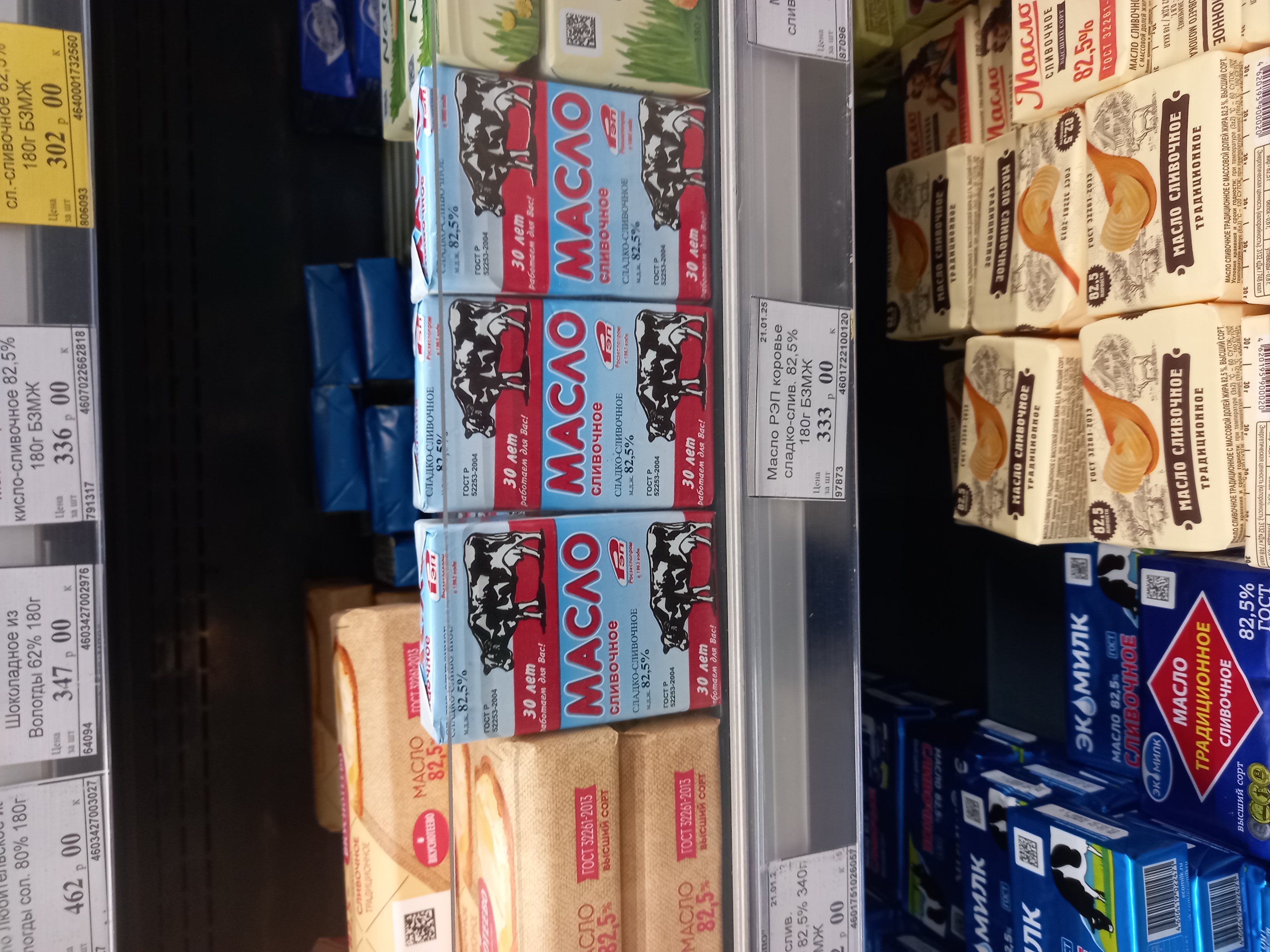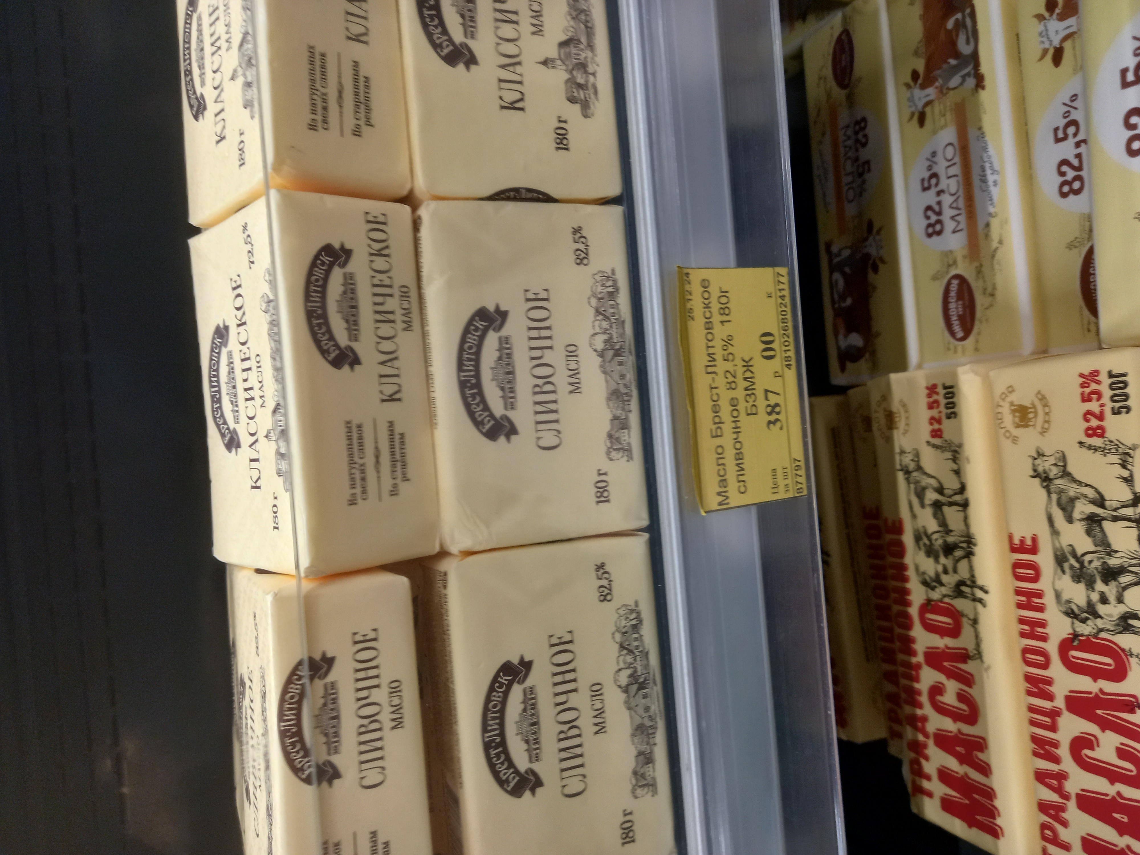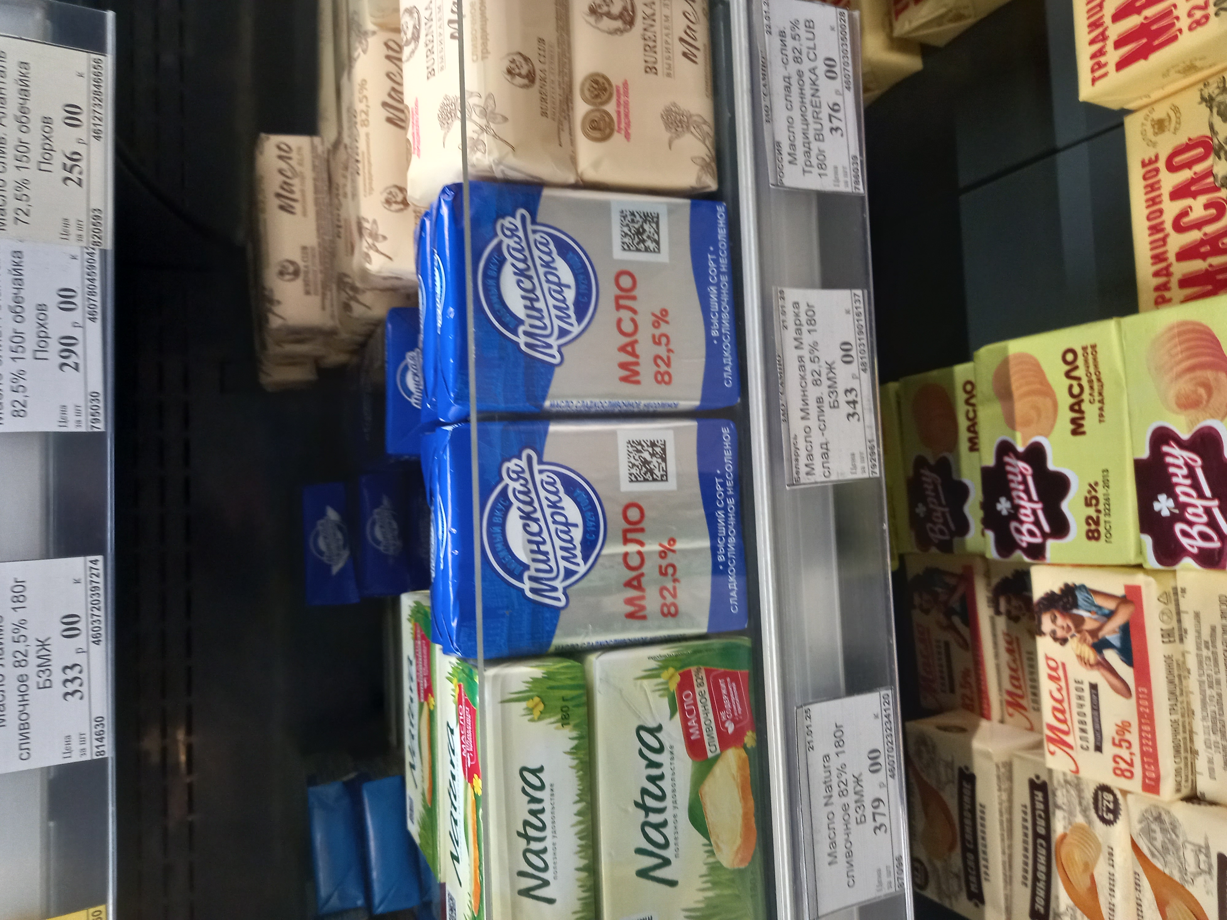 У нас в 2 -х ларьках продают белорусское масло 82,5%. В одном цена 700 рублей кг, в другом 1000. Сомневаюсь, мне показывают коробки. Беру на выпечку по 700. А на булку наше шекснинское, тоже 82, 5, цена 1000. А наше, местное 72,5 по 960 р. На свежий хлеб намажешь, соль с приправами и кофе или молоко-- вкусно!!!